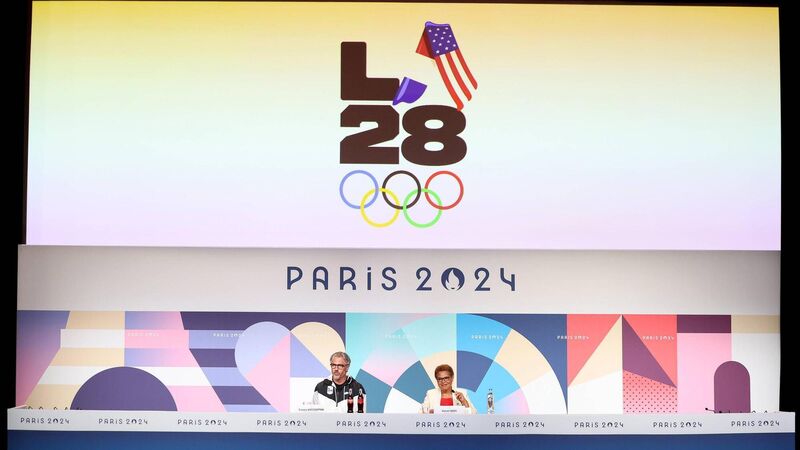 PARIS, FRANCE - AUGUST 10: A general view as the LED screen, depicting the LA28 Olympics logo, is seen whilst Casey Wasserman, LA28 Chairperson and President, and Karen Bass, Mayor of Los Angeles, speak at the LA28 Press Conference on day fifteen of the Olympic Games Paris 2024 at the Main Press Centre on August 10, 2024 in Paris, France. (Photo by Luke Hales/Getty Images)