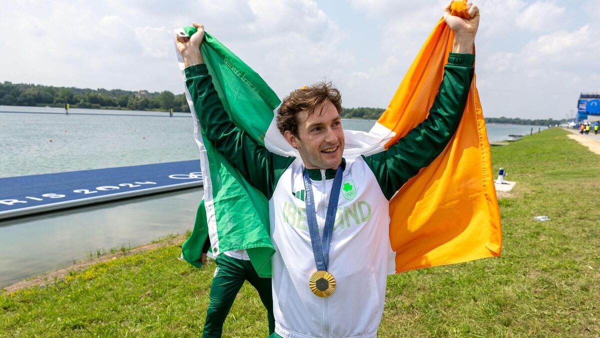 Ireland's Paul O'Donovan celebrates with his gold medal at the Paris Olympics. Picture: ©INPHO/Morgan Treacy