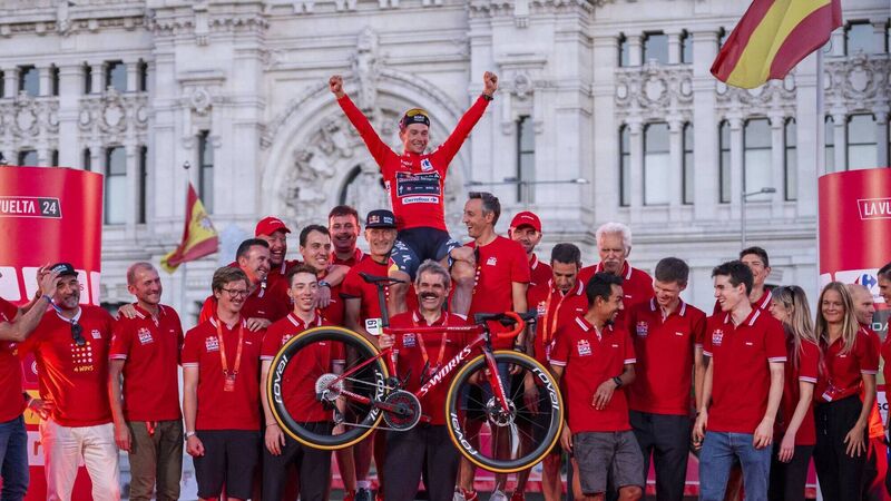 TO THE VICTOR: Primoz Roglic (C) of Slovenia and Team Red Bull Bora - Hansgrohe celebrates his victory on the podium with his team at the end of the 79th Tour of Spain 2024 - Stage 21 on September 8, 2024 in Madrid, Spain. Pic: Alberto Gardin/Eurasia Sport Images/Getty Images
