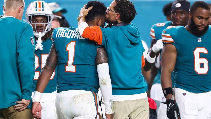 HEAD GAME: Head coach Mike McDaniel of the Miami Dolphins embraces Tua Tagovailoa after leaving the game with an injury. Pic: Megan Briggs/Getty Images