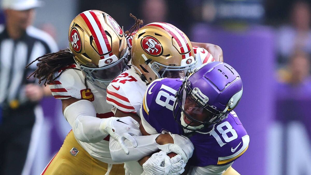 Yetur Gross-Matos #94 and Ji'Ayir Brown #27 of the San Francisco 49ers tackle Justin Jefferson #18 of the Minnesota Vikings. (Photo by Adam Bettcher/Getty Images)