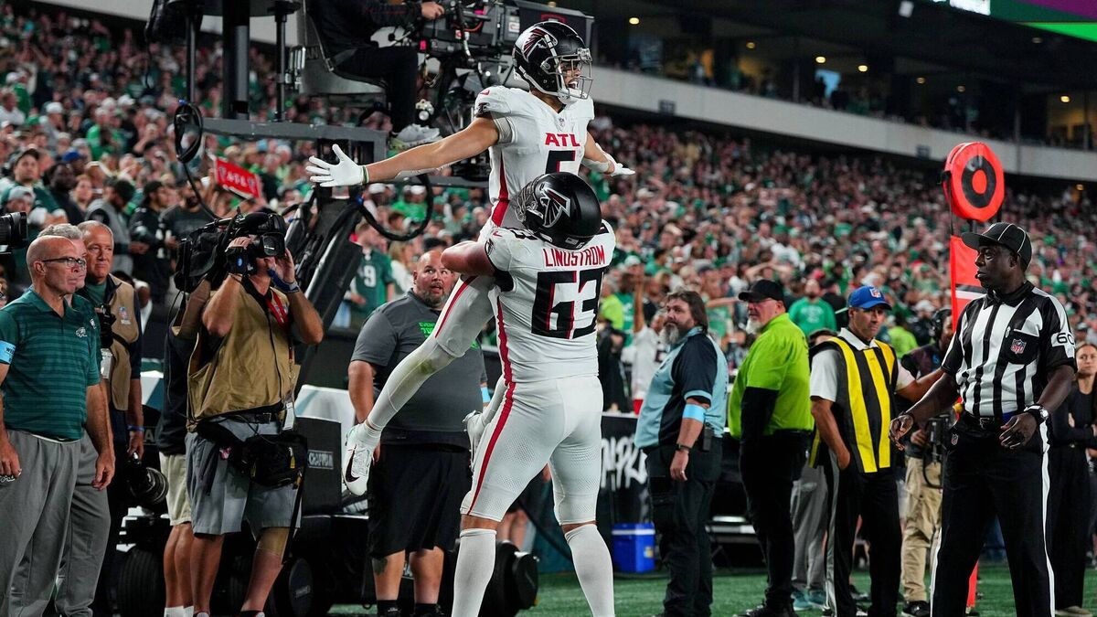 RAISE ME UP: Drake London of the Atlanta Falcons celebrates with Chris Lindstrom after scoring a touchdown against the Philadelphia Eagles. Pic: Mitchell Leff/Getty Images