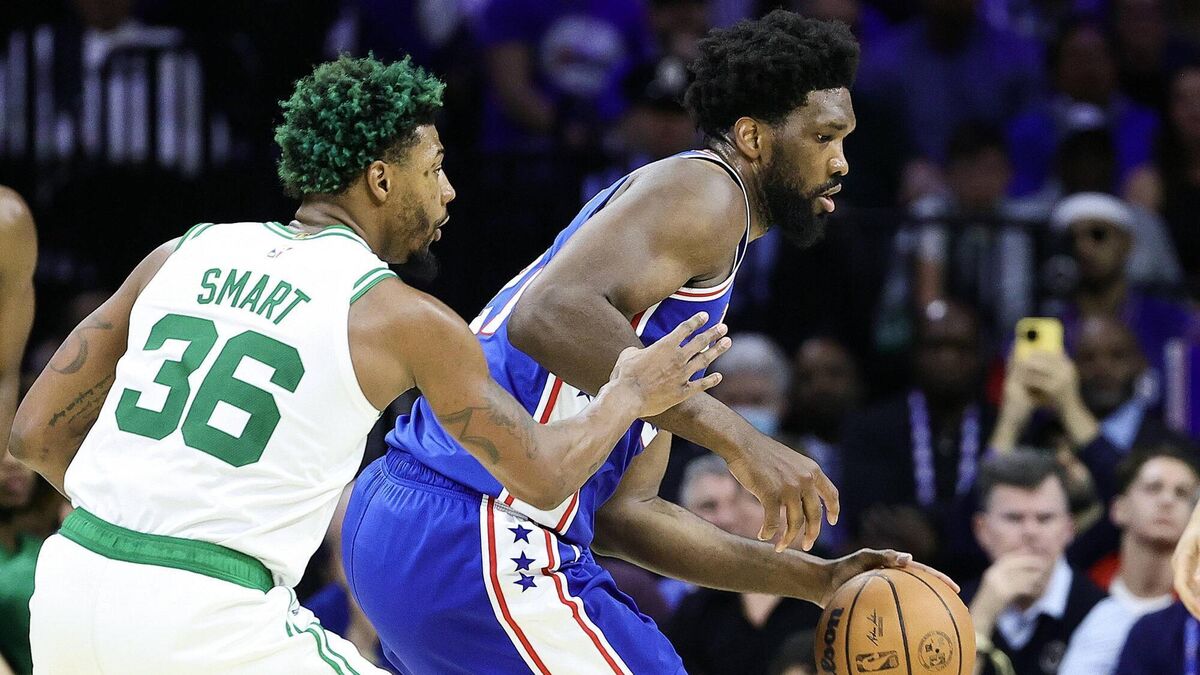 STAYING PUT:: Joel Embiid #21 of the Philadelphia 76ers drives past Marcus Smart #36 of the Boston Celtics. Pic: Tim Nwachukwu/Getty Images