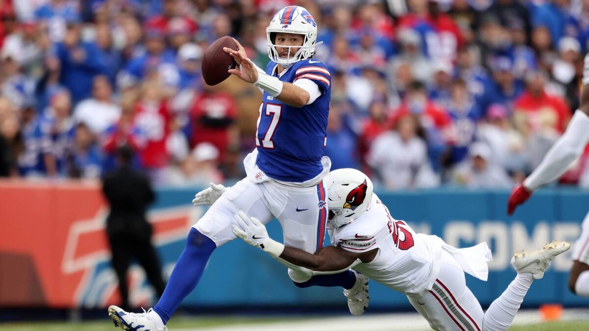 UNSTOPPABLE: Krys Barnes of the Arizona Cardinals tackles Josh Allen of the Buffalo Bills at Highmark Stadium on Monday night. Pic: Bryan M. Bennett/Getty Images