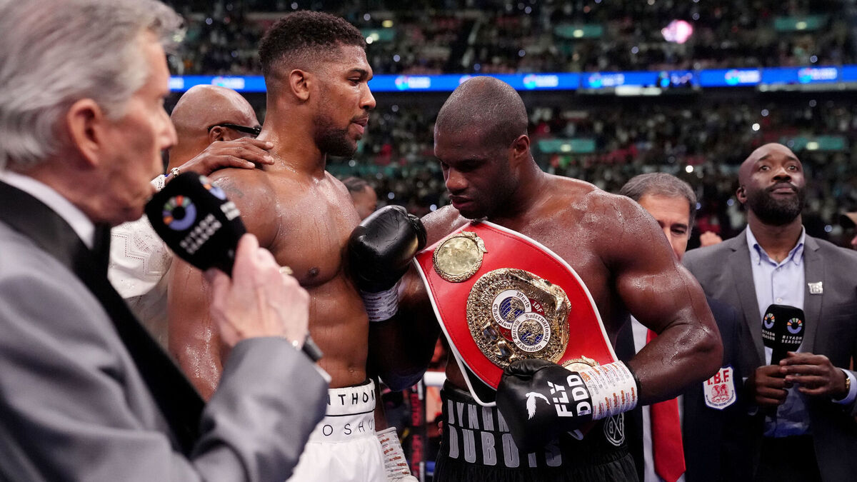 IT'S A KNOCKOUT: Anthony Joshua and Daniel Dubois following the IBF World Heavy weight bout at Wembley Stadium on Saturday night. Bradley Collyer/PA Wire.