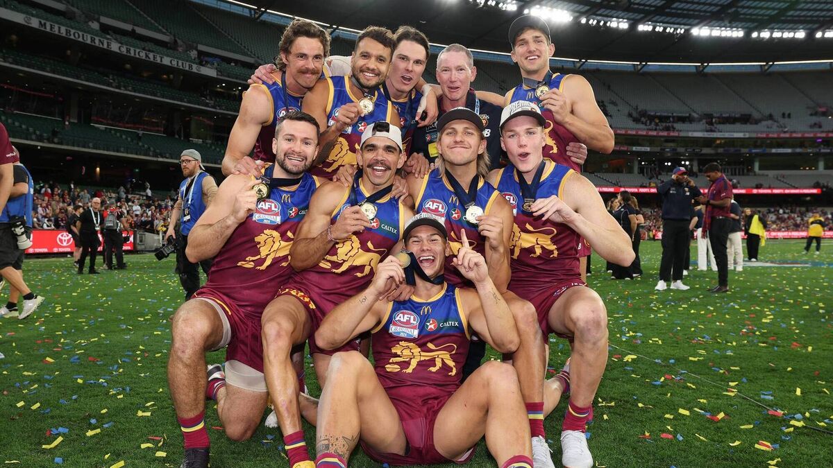 CHAMPIONS: Joe Daniher, Callum Ah Chee, Eric Hipwood, Zac Bailey, Conor McKenna, Charlie Cameron, Kai Lohmann, Logan Morris and Cam Rayner of the Lions after winning the AFL Grand Final. Picture: Daniel Pockett/AFL Photos/Getty Images