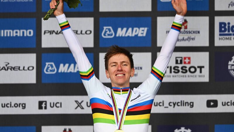 Gold medalist Tadej Pogacar of Team Slovenia poses on the podium during the 97th UCI Cycling World Championships in Zuric. Pic: Tim de Waele/Getty Images