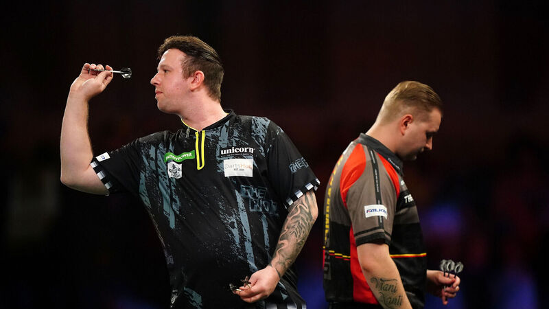 CALLAN COLLECTED: Callan Rydz in action during his third round match against Dimitri Van den Bergh (right) on day twelve of the Paddy Power World Darts Championship at Alexandra Palace, London. Pic: Zac Goodwin/PA Wire