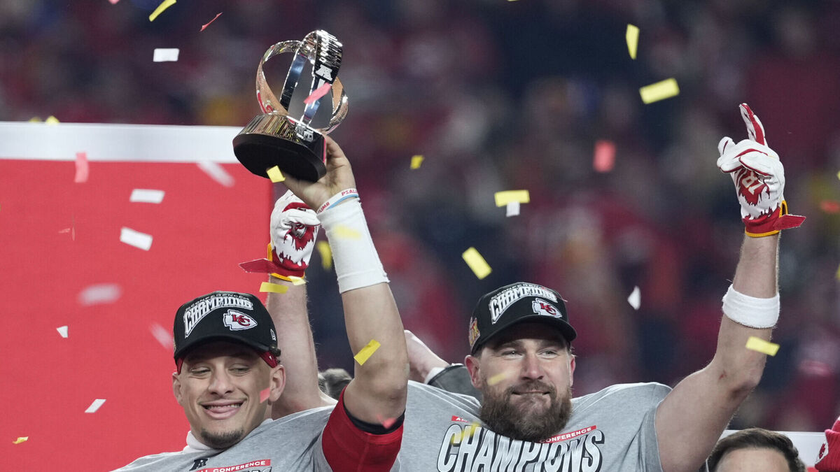 VILLAIN ENERGY? Kansas City Chiefs quarterback Patrick Mahomes, left, and tight end Travis Kelce celebrate after the Chiefs defeated the Buffalo Bills in the AFC Championship. Pic: Ed Zurga/AP