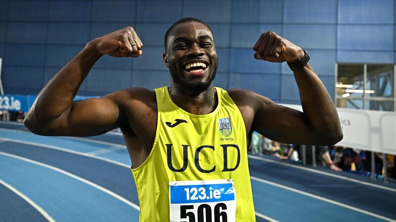 ANXIOUS WAIT: Bori Akinola of UCD AC, Dublin, celebrates after winning the men's 60m final during day two of the 123.ie National Senior Indoor Championships. Pic: Sam Barnes/Sportsfile
