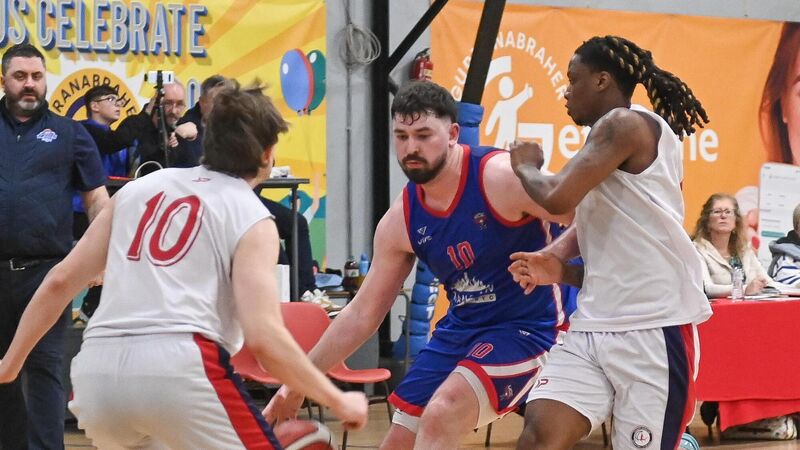 HEAT OF BATTLE: UCC Demons' David Lehane is challenged by Templeogue's Daniel Cassidy and Jacolbey Owens, during their Men's Super League clash.