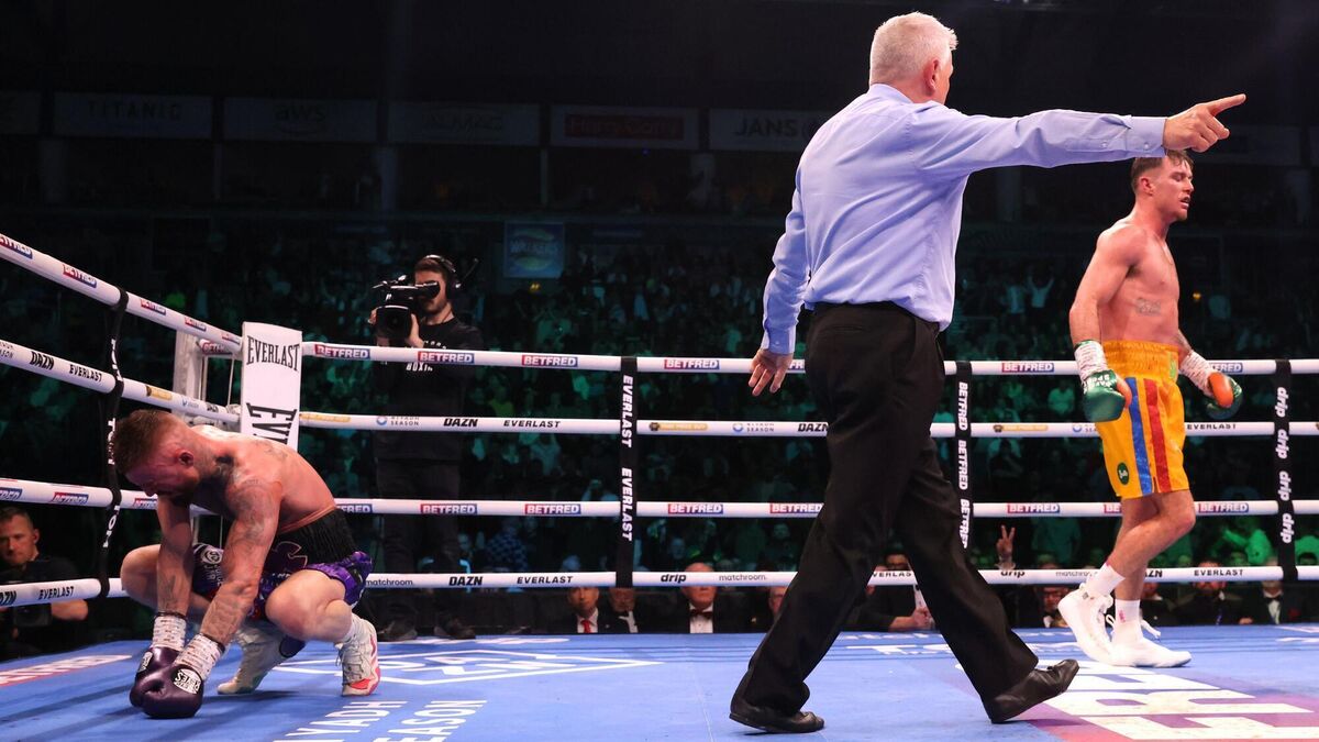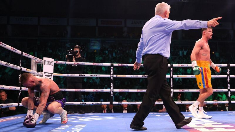 FLASHPOINT: Lewis Crocker (left) reacts after being struck by Paddy Donovan (right) as referee Marcus McDonnell temporarily pauses the welterweight bout at the SSE Arena, Belfast. Pic: Peter Morrison/PA Wire