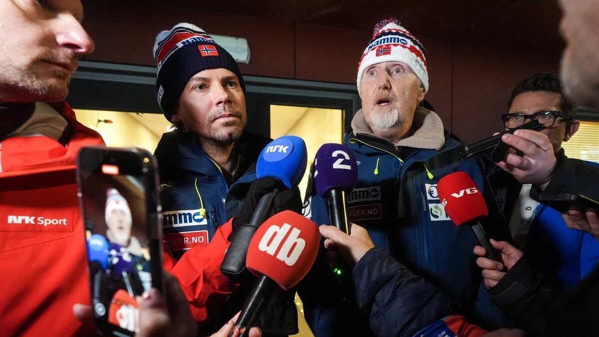 The Norwegian ski jumping national team's coach Magnus Brevig (left) and sport director Jan-Erik Aalbu deliver a press statement in Granaasen, Norway, on March 8, 2025, after two Norwegian jumpers were disqualified and accused of cheating after the men's large hill jumping competition during the World Ski Championships in Trondheim. Photo by TERJE PEDERSEN/NTB/AFP via Getty ImagesÂ