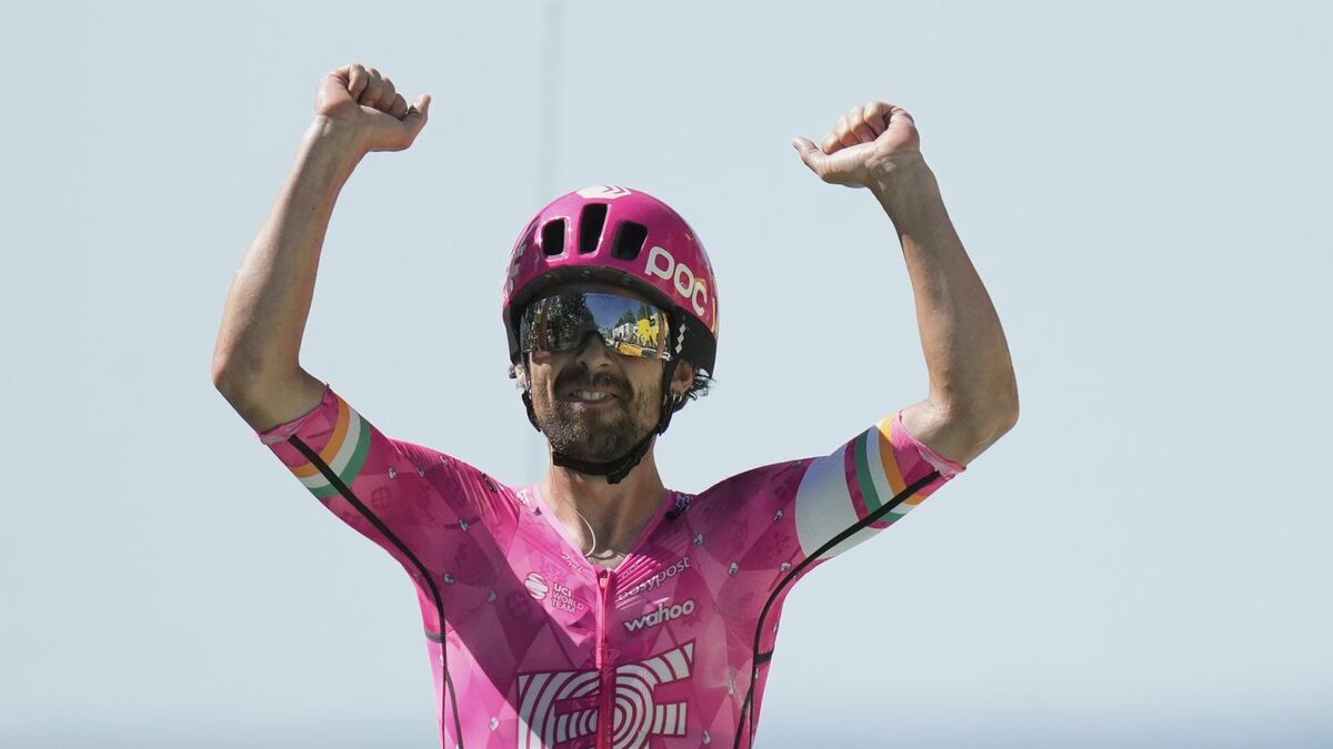 Ireland's Ben Healy celebrates as he crosses the finish line to win the sixth stage of the Tour de France. Picture: Mosa'ab Elshamy/AP