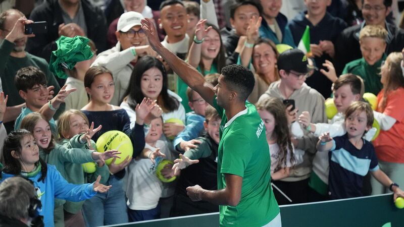 CROWD FAVOURITE: Michael Agwi hands out free jerseys at the end of the Davis Cup 2025 World Group II match with China at Sport Ireland Campus, Dublin. Pic: Niall Carson/PA Wire