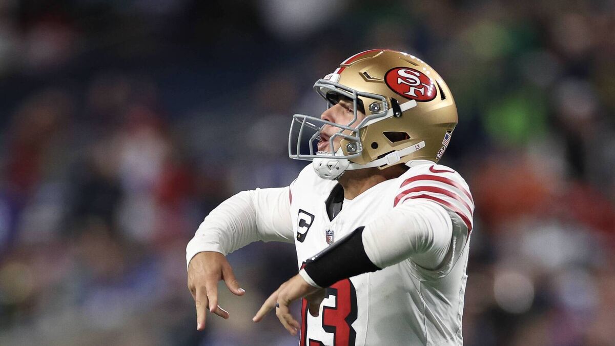 PURDY GOOD WIN: Brock Purdy reacts after throwing a pass for a touchdown. Pic: Steph Chambers/Getty Images.