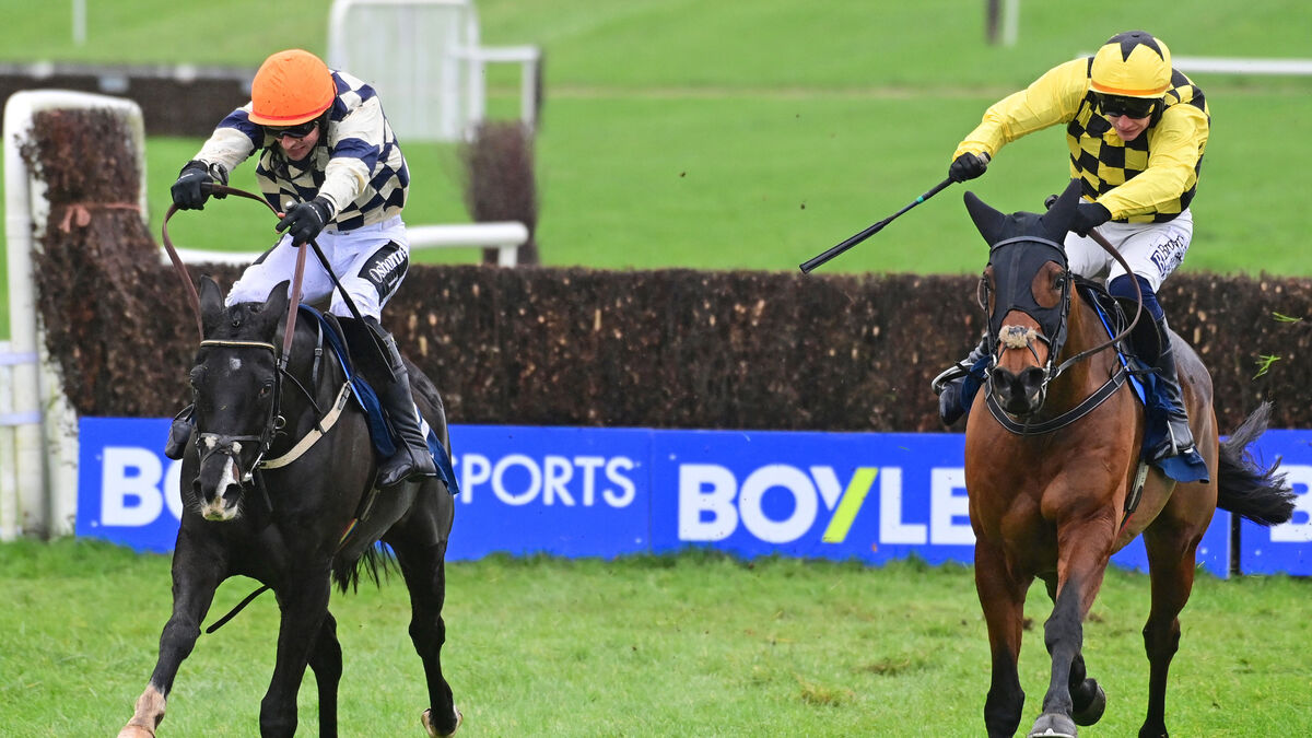 Kappa Jy Pyke and Danny Mullins (left) win the Thurles Racecourse Beginners Steeplechase from Salvator Mundi (right). Pic: Healy Racing Photo.