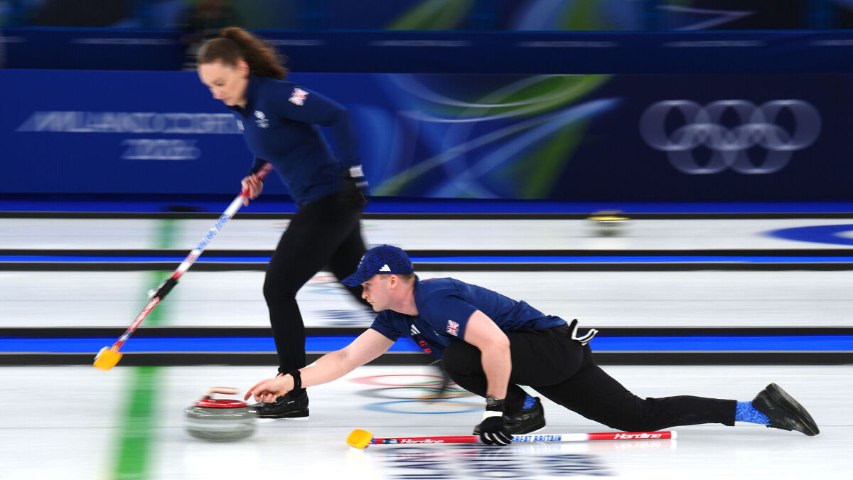 Great Britain's Bruce Mouat (right) in action as Jennifer Dodds looks on during the Curling Mixed Doubles, Round Robin Session against Norway, at the Cortina Curling Olympic Stadium, Italy. Picture:Â Andrew Milligan/PA