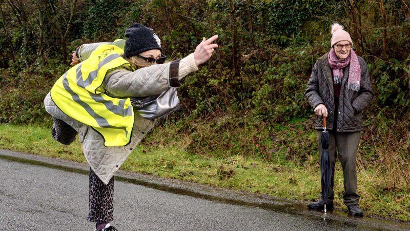 Organiser Eileen Gobnait Ní Lionáird in action during the all-Gobnait road bowling event in Ballyvourney, part of the St Gobnait Festival. Picture Chani Anderson