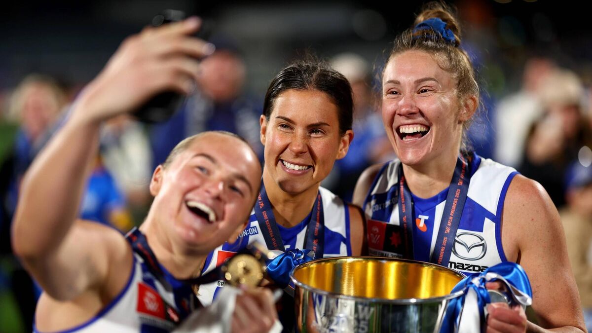 Meath's Vikki Wall, alongside Libby Birch and Tahlia Randall of the Kangaroos, take a selfie with the Premiership Cup. Pic: Josh Chadwick/AFL Photos/via Getty Images