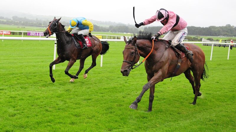 Line Out, right, responds to Denis O'Regan's urgings to win the Irish Stallion Farms EBF Handicap Chase at the expense of Cooldine Bog.Â