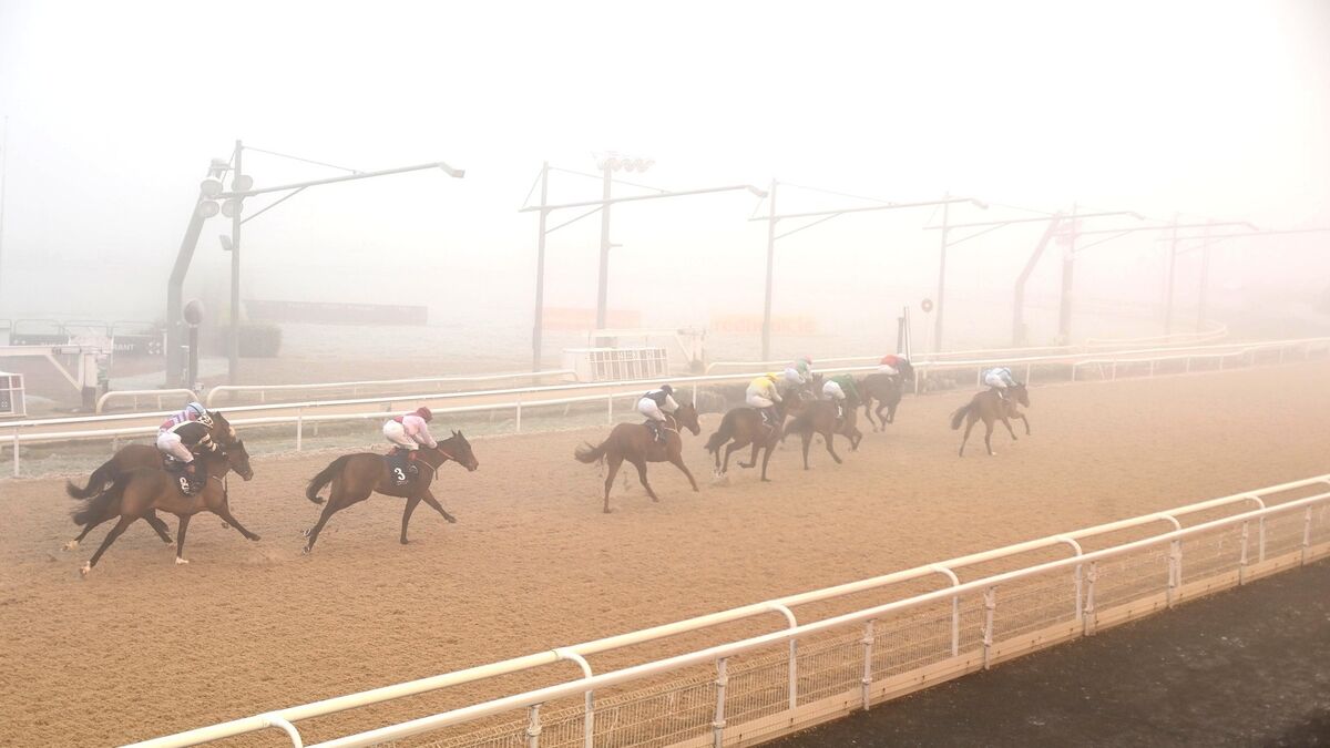 GLOOMY PICTURE: A view of the first race at a foggy Dundalk on Monday. The meeting was abandoned afterwards. Picture: Healy Racing