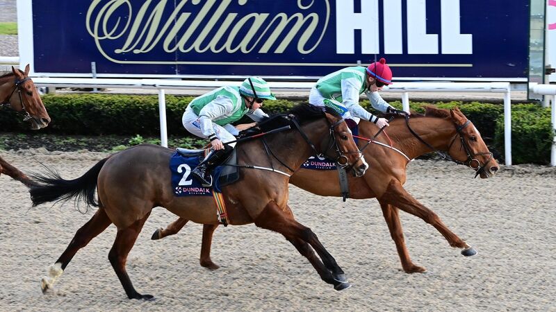 GAMBLE LANDED: Mark Enright steers Mehman, right, to victory in the Happy New Year From Dundalk Stadium Handicap. Picture: Healy Racing