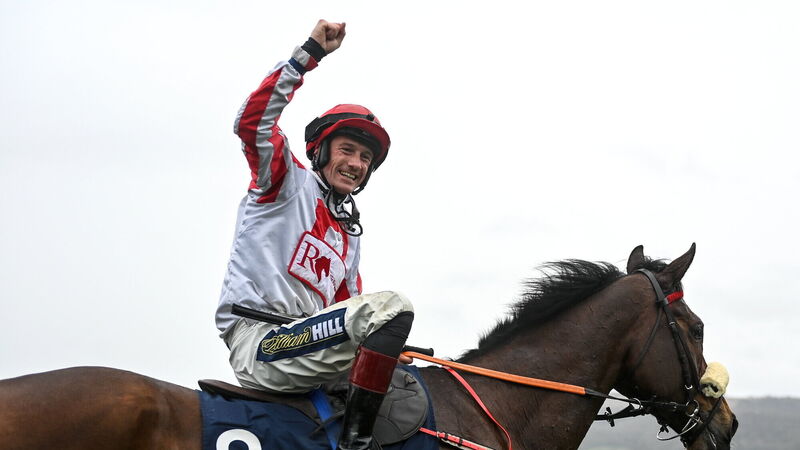 HELD ON: Jockey Sam Twiston-Davies celebrates on The Real Whacker after winning the Brown Advisory Novices' Chase during day two of the Cheltenham Racing Festival. Pic: Seb Daly/Sportsfile