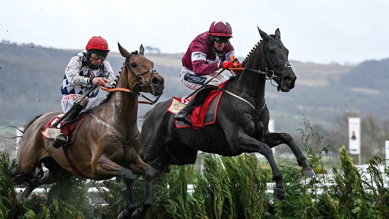 CHAMP: Delta Work, with Keith Donoghue up, jumps the last ahead of second placed Galvin, with Davy Russell up, on their way to winning the Glenfarclas Cross Country Chase. Pic: Harry Murphy/Sportsfile