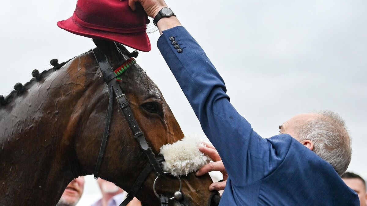 GOOD TIME'S RETURNING: Winning trainer Tony Martin places a hat on Good Time Jonny after winning the Pertemps Network Final Handicap Hurdle during day three of the Cheltenham Racing Festival. Pic: Seb Daly/Sportsfile