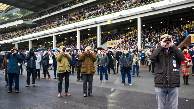 Punters watch the early stages of the Jack De Bromhead Mares' Novices' Hurdle during day three of the Cheltenham Racing Festival at Prestbury Park on Thursday. Picture: Harry Murphy/Sportsfile