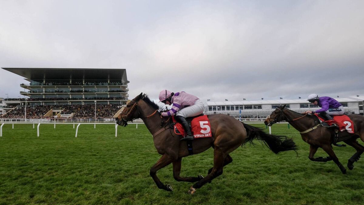 NECK AND NECK: Bryony Frost riding Il Ridoto (left) being chased up the hill by Gavin Sheehan on Fugitif (purple) in the Virgin Bet December Gold Cup Handicap Chase at Cheltenham last weekend. Pic: Alan Crowhurst, Getty