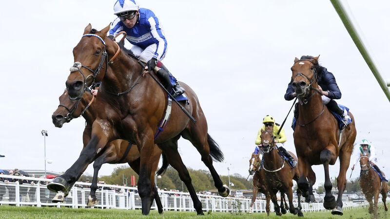 CLASSIC CONTENDER: Bellum Justum and Oisin Murphy en route to winning the Betfred Blue Riband Trial for trainer Andrew Balding from Defiance and Chief Little Rock. Picture: Healy Racing