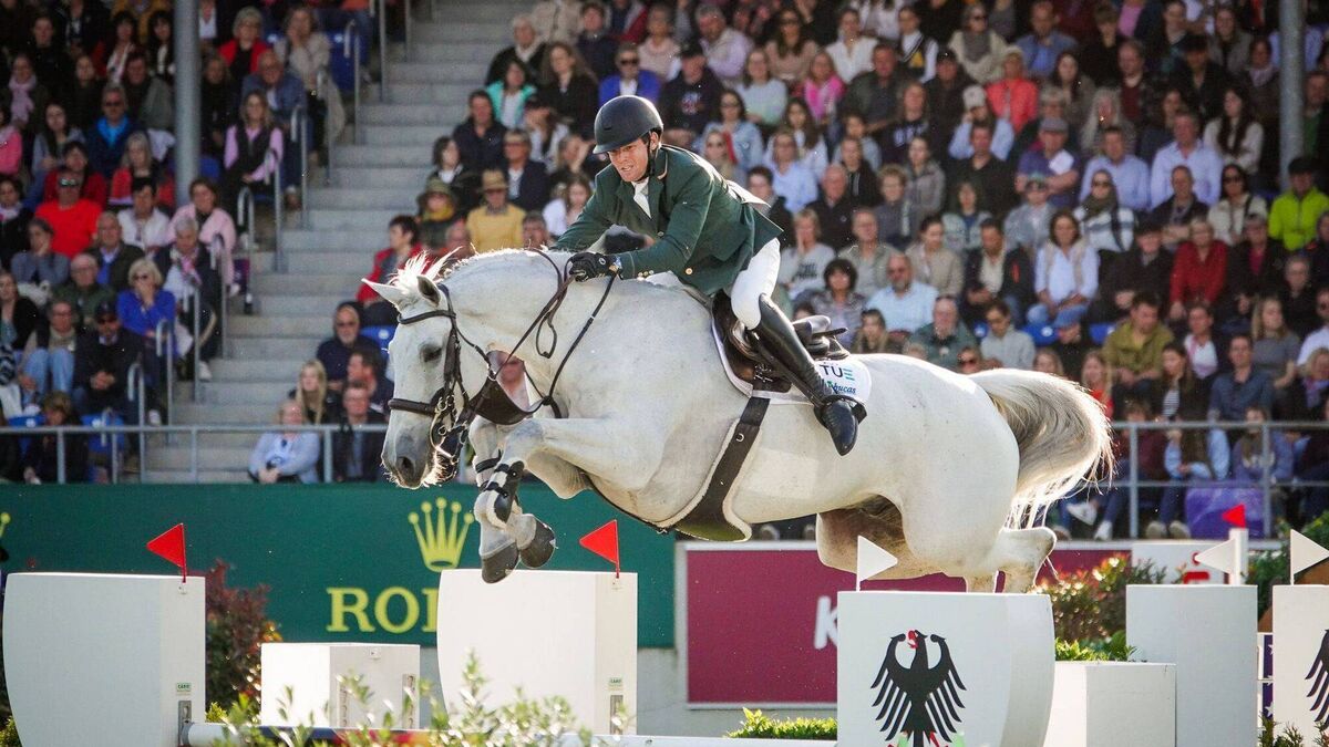 NATIONS CUP WIN: Shane Sweetnam and the Irish Sport Horse James Kann Cruz effortlessly jumping around the Aachen arena to a clear round as the team finish the competition on a zero total. Pic: Horse Sport Ireland