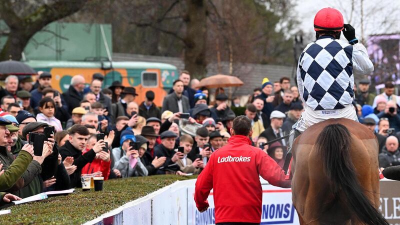 BURNING A HOLE: Ballyburn and Paul Townend soak in adulation after winning at Leopardstown in February. Pic: Healy Racing