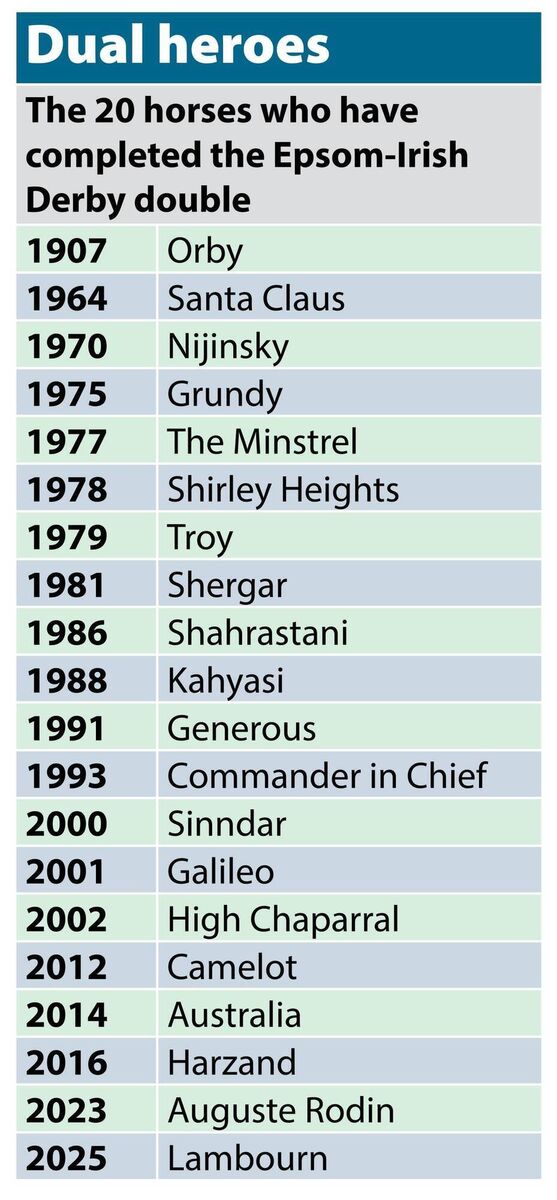 Lambourn emulated his sire, Australia, by completing the Epsom Derby-Dubai Duty Free Irish Derby double, and in doing so became the twentieth horse to have his name emblazoned on both rolls of honour.
