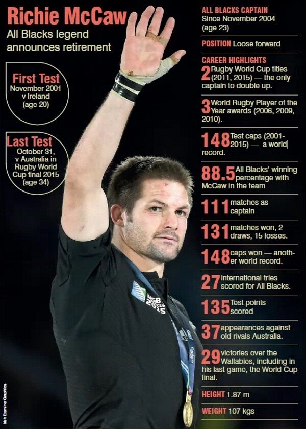Almost three weeks after New Zealand won a second successive World Cup with McCaw at the helm, the 34-year-oldâs retirement might have been widely expected, yet it still leaves a feeling of sadness that he will no longer grace a game he has transcended for so long.