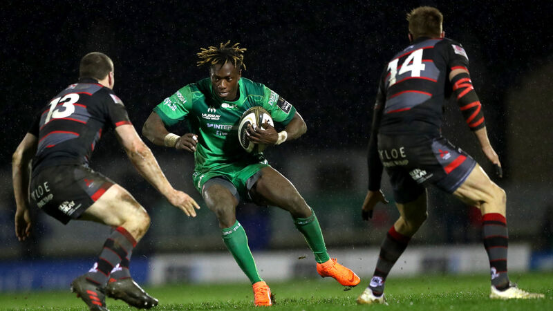 Niyi Adeolokun takes on Edinburgh's Mark Bennett and Dougie Fife in 2018. Picture: Inpho