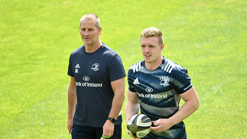 Stuart Lancaster with Dan Leavy during Leinster training yesterday at the RDS.