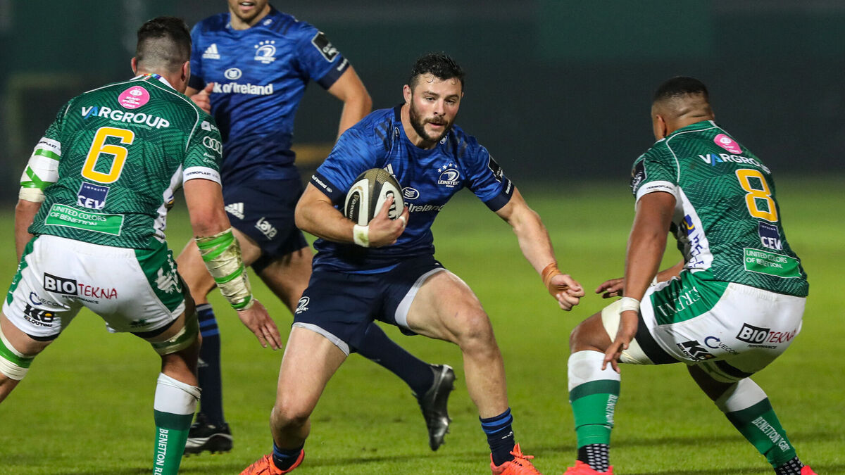 Robbie Henshaw of Leinster in action against Sebastian Negri, left, and Toa Halafihi of Benetton during the Guinness PRO14 match against Benetton at Stadio Monigo in Treviso. Picture: Daniele Resini/Sportsfile