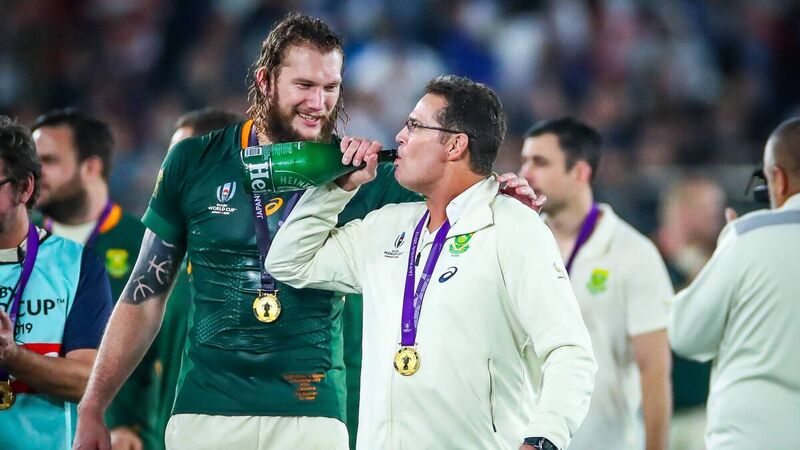South Africa's RG Snyman celebrates with Rassie Erasmus after the 2019 Rugby World Cup final. Picture: INPHO/James Crombie