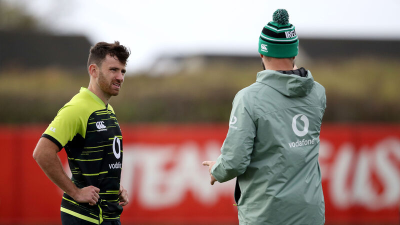 Hugo Keenan with head coach Andy Farrell at Ireland training yesterday. The Leinster man will make his international debut this weekend. Picture: INPHO/Dan Sheridan
