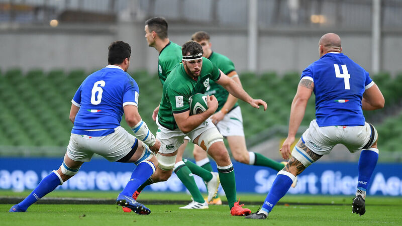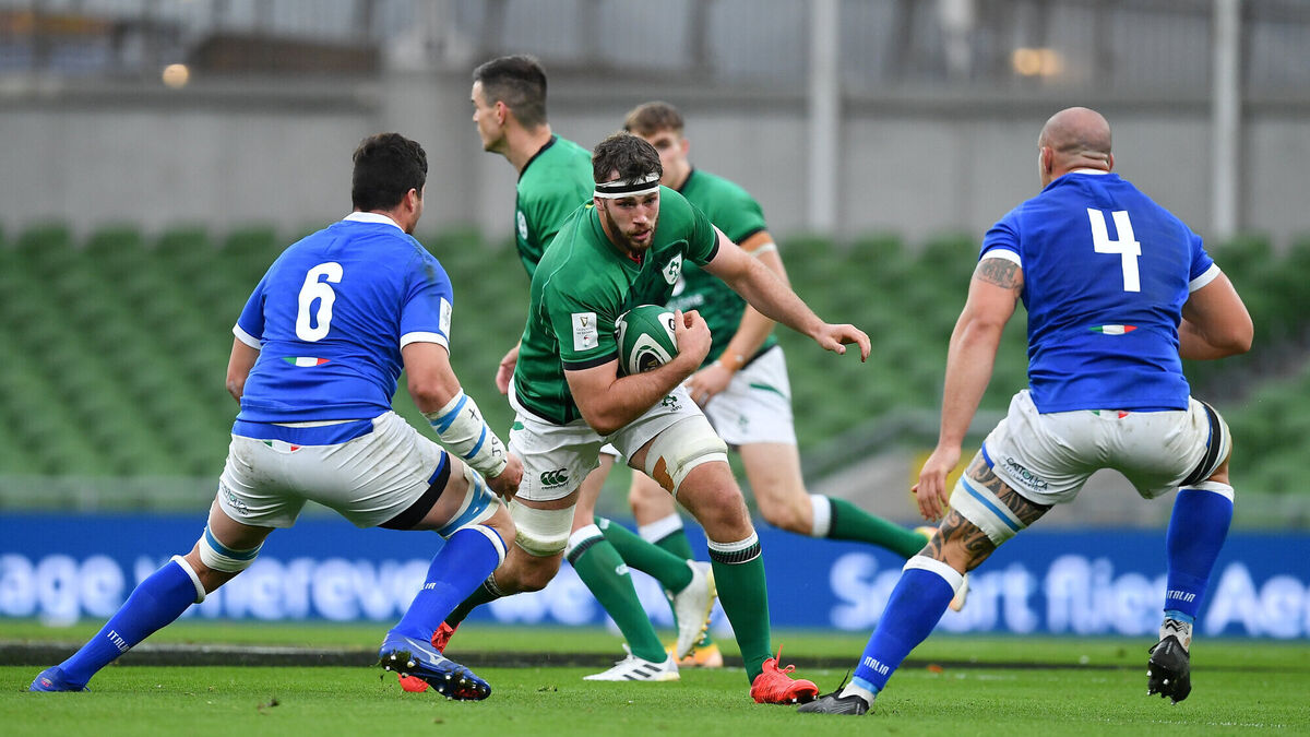 Caelan Doris of Ireland in action against Sebastian Negri, left, and Marco Lazzaroni. Picture: Brendan Moran/Sportsfile