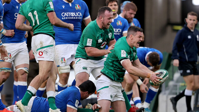 Johnny Sexton celebrates scoring a try against Italy last week. Ireland need another bonus point win to secure a Six Nations title. Picture:Â INPHO/Dan Sheridan
