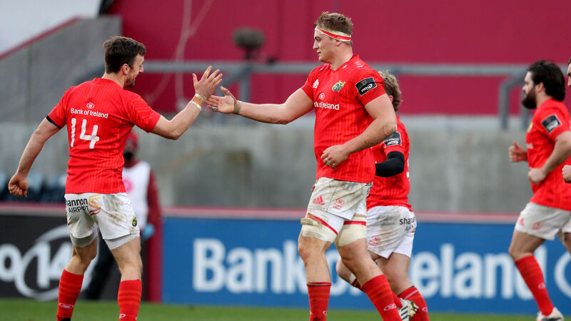 OUTSTANDING: Munster’s Gavin Coombes celebrates scoring a try, one of three for the No 8, with Darren Sweetnam during the Guinness PRO14 clash with Ospreys at Thomond Park. INPHO/Dan Sheridan