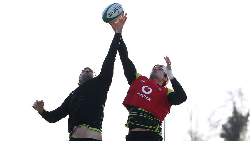 Peter O'Mahony and Quinn Roux training at the IRFU High Performance Centre in Blanchardstown yesterday. Picture: INPHO/Dan Sheridan