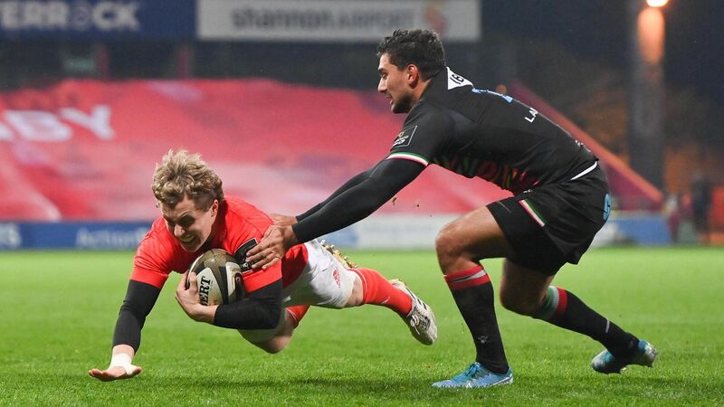 Craig Casey scores Munster's seventh try despite the tackle of Simone Marinaro of Zebre during the Guinness PRO14 match at Thomond Park in Limerick. Picture: Ramsey Cardy/Sportsfile
