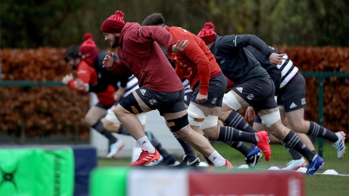 STARTERS ORDERS: Munster’s Liam O’Connor sets the pace at squad training at UL ahead of the Champions Cup clash with Harlequins in Thomond Park on Sunday.