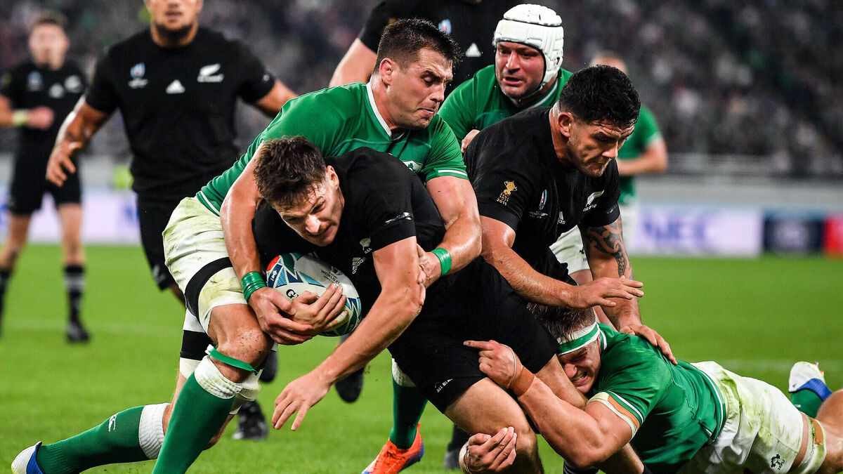 George Bridge of New Zealand is tackled by CJ Stander, left, and Josh Van der Flier of Ireland during the 2019 Rugby World Cup quarter-final. Photo by Brendan Moran/Sportsfile