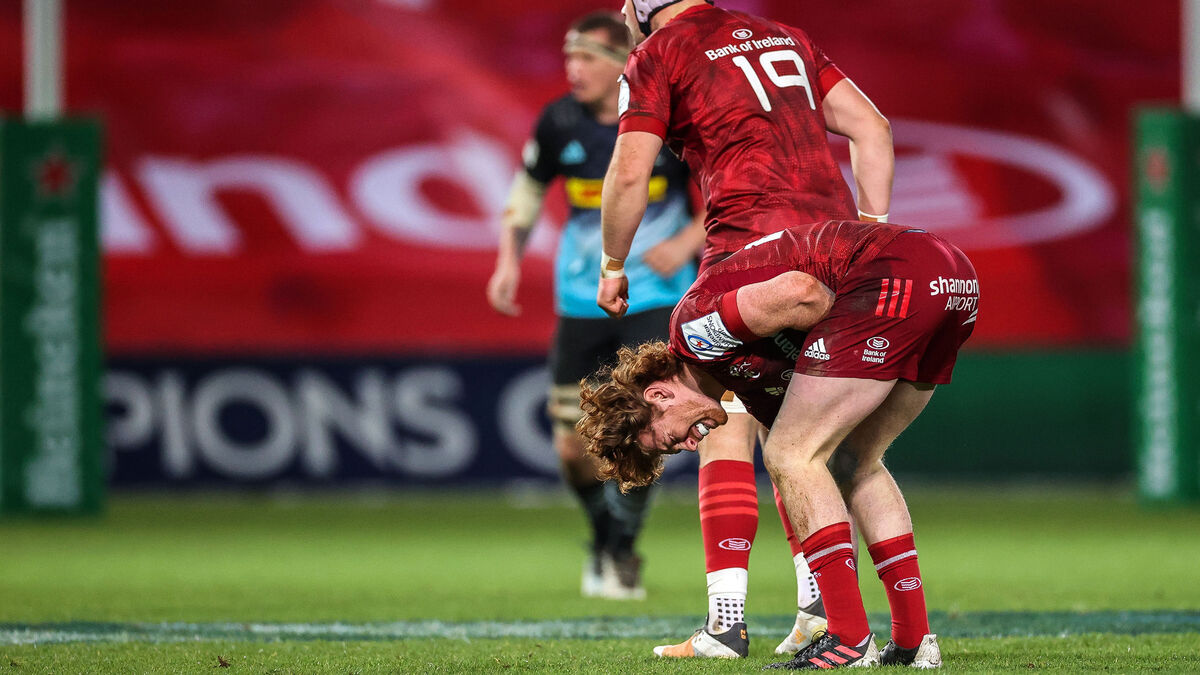 Munster's Ben Healy after receiving a late tackle from Joe Marler of Harlequins. Picture:Â INPHO/Gary Carr